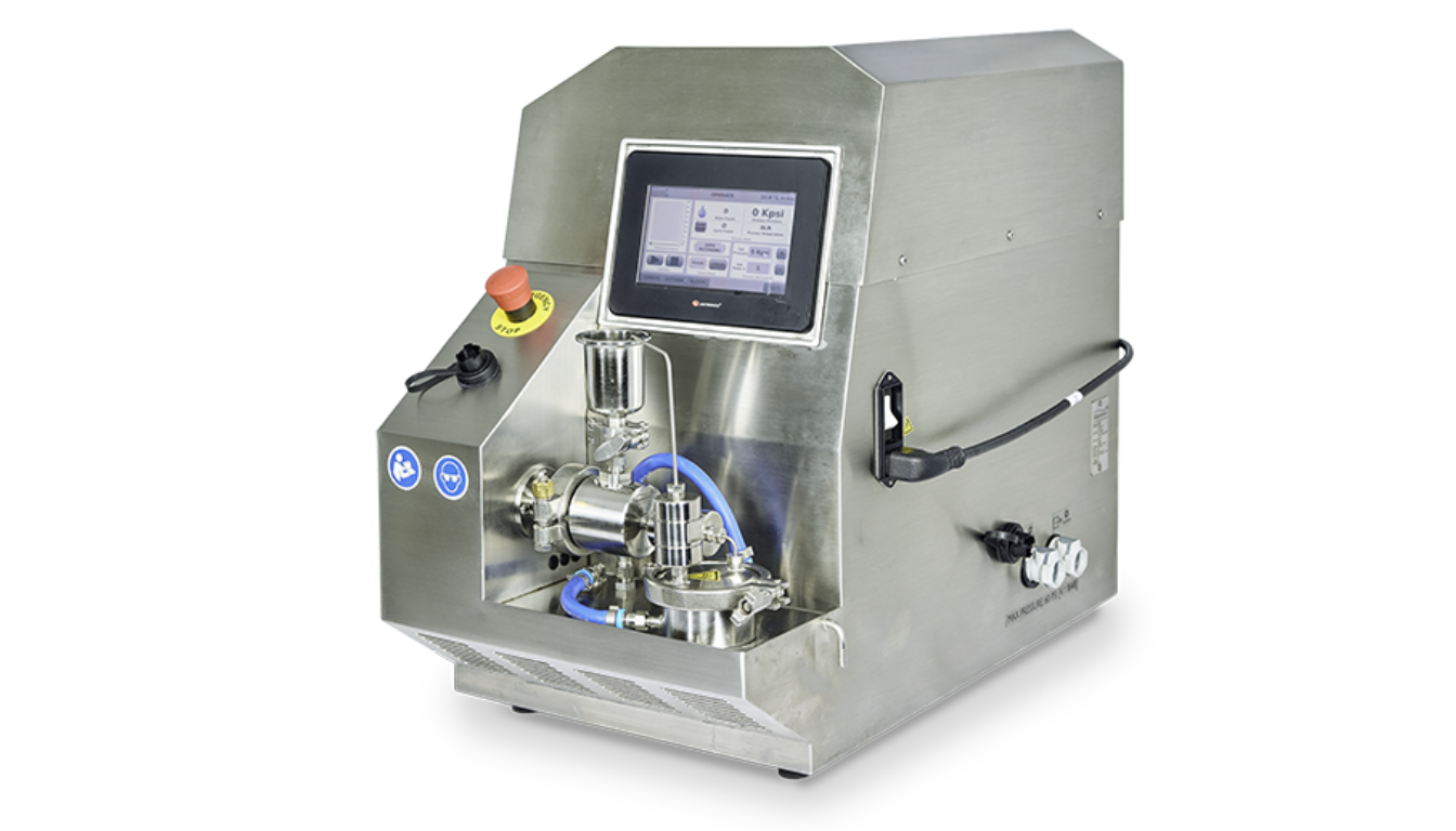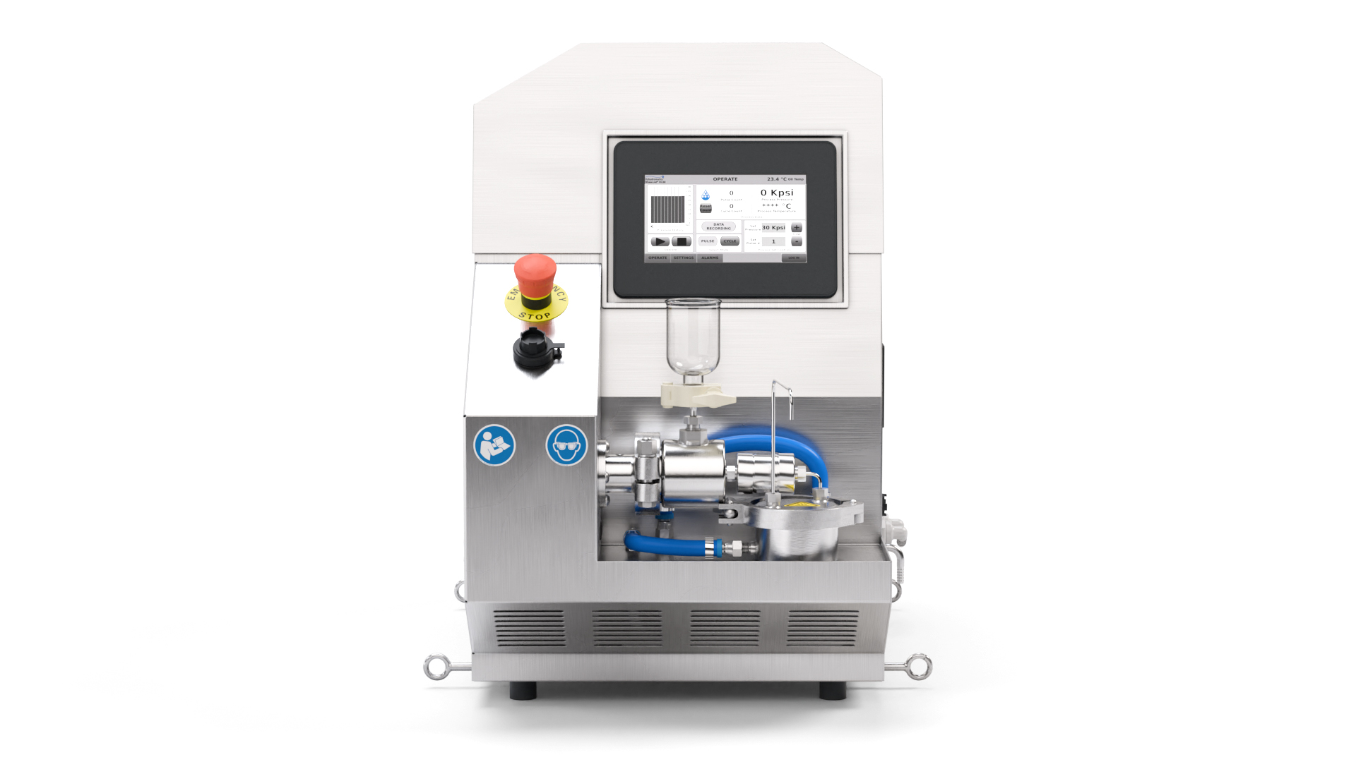 The Dyhydromatics ShearJet® HL60 V2 processor is our R & D workhorse. It is an electric hydraulic driven processor designed for volumes ranging from 3 mL to 500 mL and beyond. Pressures range from 5,000 to 30,000 psi. Each stroke is 1 mL which generates a flow rate of 68 mL/min. Our product heat exchanger provides superior cooling via a chiller. The small footprint and quiet operation saves valuable lab space and the need for hearing protection. Its robust design allows continuous operation at maximum pressure. Our uniquely designed HMI provides process parameters including; process pressure, process duration (in pulse or cycle modes), product temperature and data acquisition. The drive pump is designed to provide an optimal pressure profile when paired with our Reaction Chamber® module. This combination will process products consistently and repetitively.